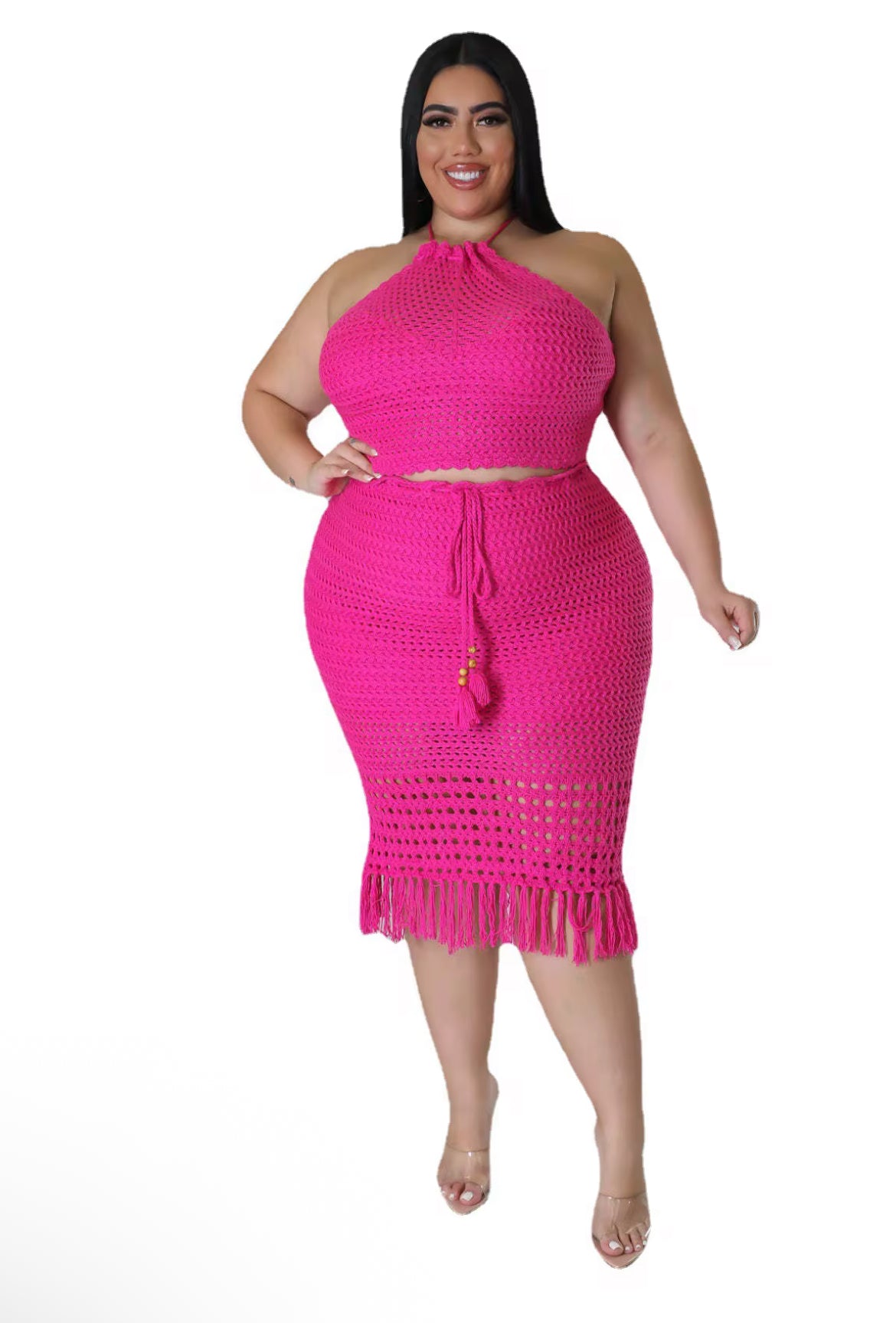 Serve soft glam and island energy in our Green Goddess Crochet Set — part of our exclusive Curvy Collection. This two-piece knit look features a halter-style crop top and matching midi skirt with flirty fringe detail for that perfect mix of effortless and elevated.
